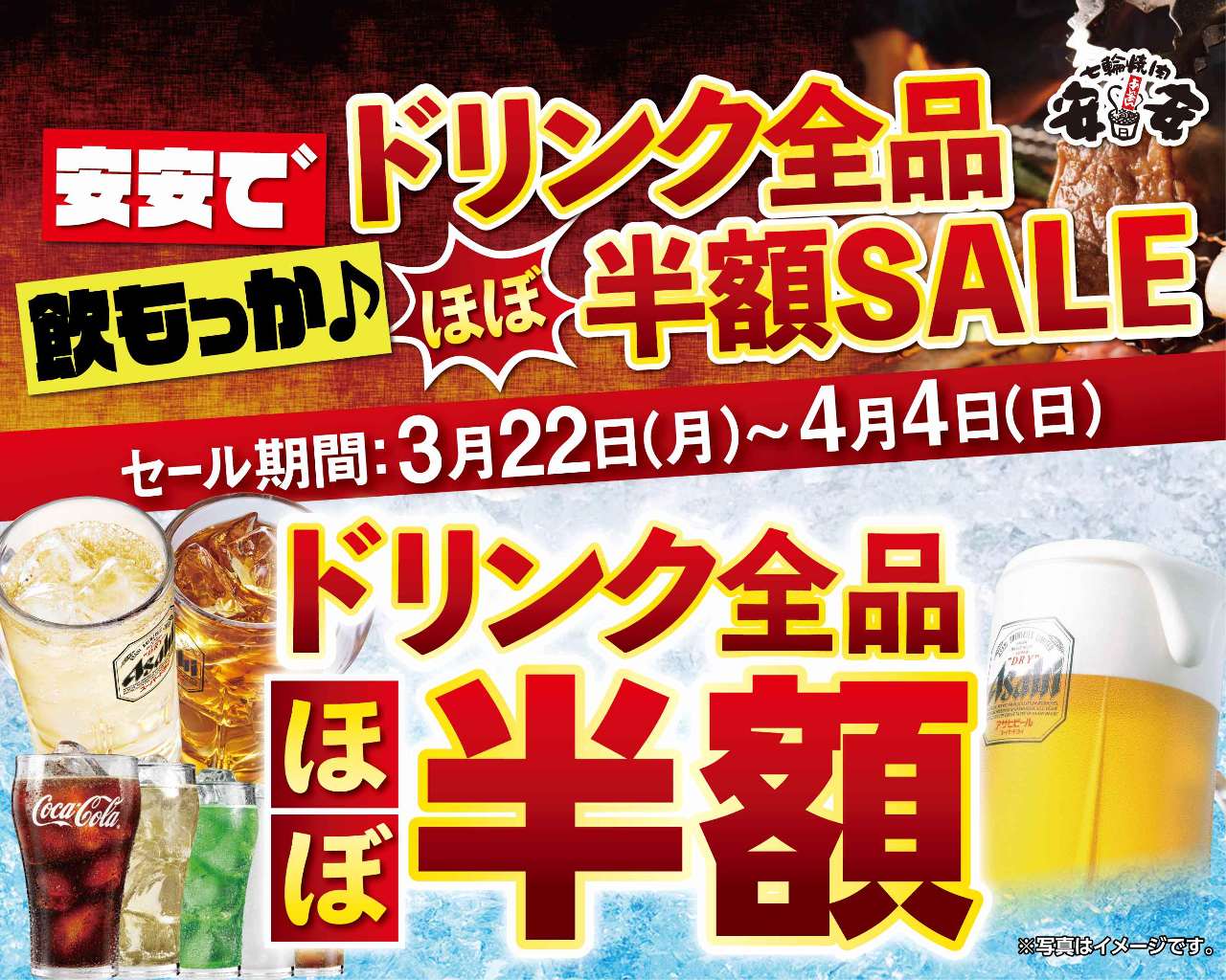 食べ放題 とは思えないほど 高品質なお肉 を揃えています!!焼肉食べ放題 七輪焼肉 安安『満腹コース 1900円(税込) お食事、コンパ、デート、お子様連れ 食べ放題;活気溢れる楽しいお店!! 他店では単品クラスのお肉が食べ放題!飲み放題!! お腹いっぱい食べて、楽しく飲んで 90分 男性 ¥3,000円 女性